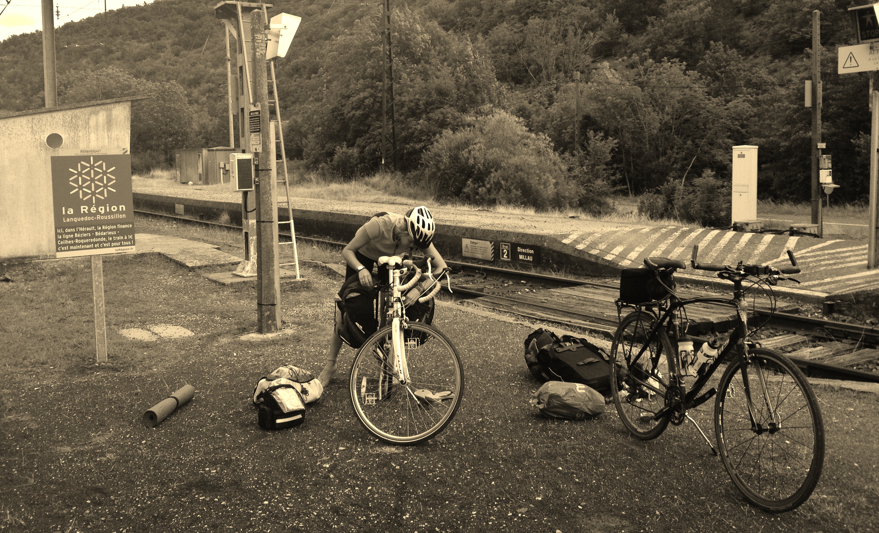2014-07-29 19.29.13 October 21, 2014 by Richard Hoptgf Leave a comment Getting off a train with full bike lods is fun when there’s no platform! 43.650406 3.161933